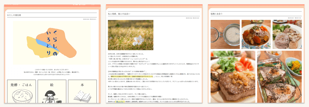 テーマに、温かみを感じていただけるようなデザインにしま私の好きな「発酵・ごはん」「絵」「本」のテーマごとにブログを掲載するサイトを作成しました。暮らし、がテーマなので温かみのあるデザインにしました。